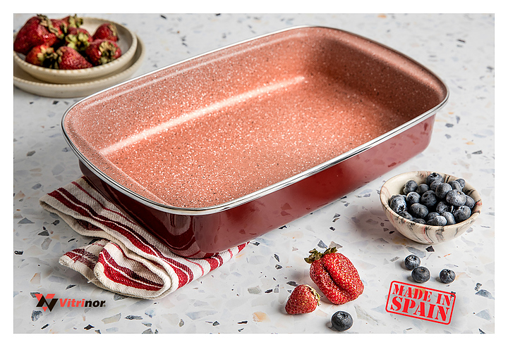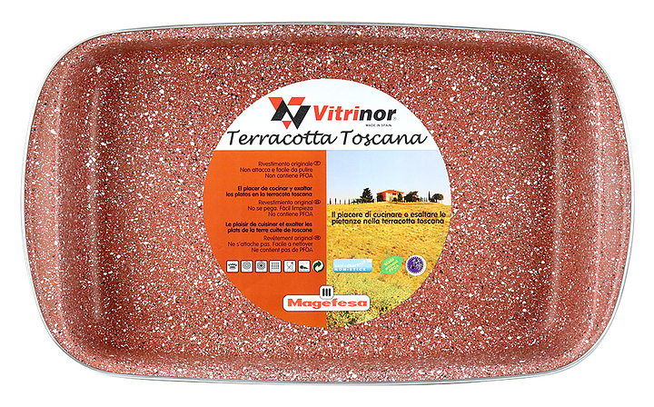 Прямоугольная форма Vitrinor Toscana 30 используется на предприятиях общественного питания и торговли, а также в домашних условиях для приготовления широкого спектра блюд в духовых шкафах и на любых типах варочных поверхностей, включая индукционные. Изделие выполнено из стали с двухслойным антипригарным покрытием, не содержащим PFOA, внешнее покрытие - двухслойная стеклоэмаль, обожженная при температуре 820 °С, терракотового цвета. Особенности: