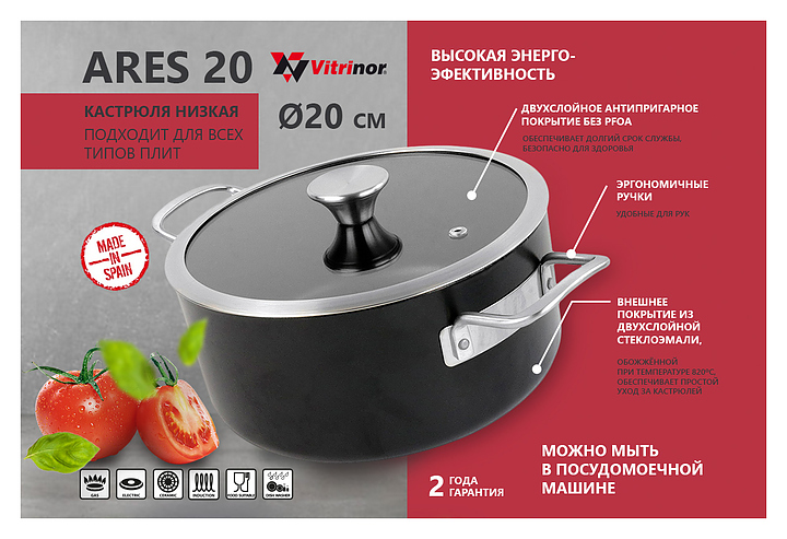 Низкая кастрюля Vitrinor Ares 20 используется на предприятиях общественного питания и торговли, а также в домашних условиях для приготовления широкого спектра блюд на любых типах варочных поверхностей, включая индукционные. Модель оснащена стеклянной крышкой с ободком из нержавеющей стали и отверстием для выпуска пара. Изделие выполнено из стали c ферромагнитными свойствами с двухслойным антипригарным покрытием, не содержащим PFOA, внешнее покрытие - двухслойная стеклоэмаль, обожженная при температуре 820 °С, черного цвета, ручки - из нержавеющей стали. Особенности: