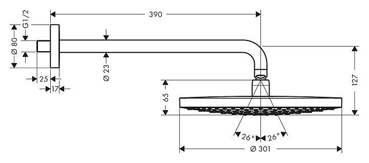 Верхний душ Hansgrohe Raindance Select S 300 2jet 27378400 благородаря дизайну и продуманным функциям доставляет необыкновенное наслаждение от принятия душа на высочайшем уровне. Модель имеет душевую головку круглой формы и образует впечатляюще большую зону принятия душа. Известковый налет на силиконовых форсунках с легкостью удаляется благодаря технологии QuickClean, достаточно слегка потереть и структура струи снова идеальна. Душ предусматривает монтаж на стену. В комплект поставки входит верхний душ, держатель верхнего душа. Особенности: