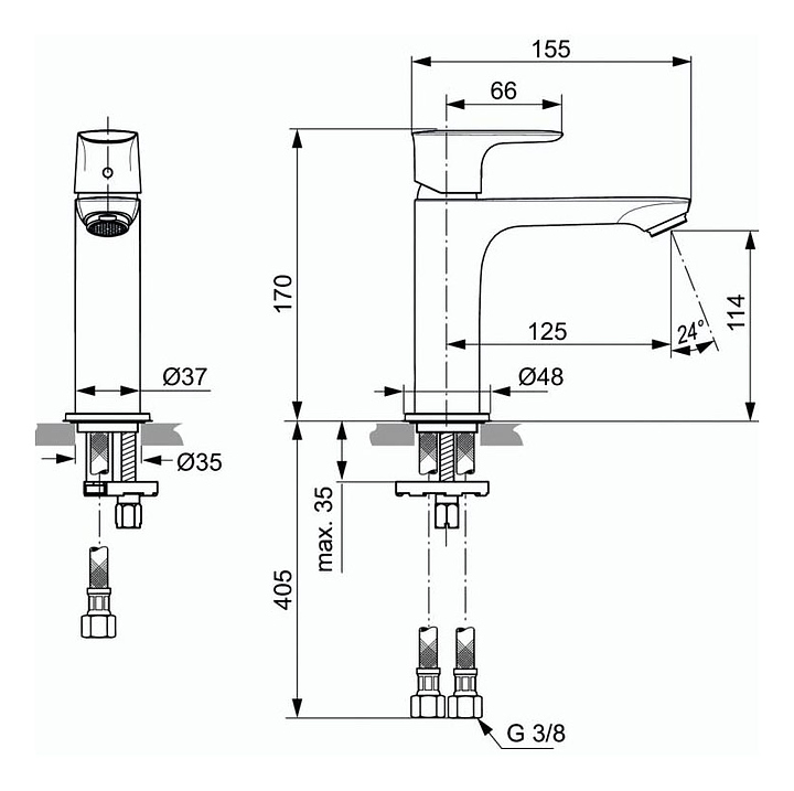 Смеситель для раковины Ideal Standard CONNECT AIR A7015AA предназначен для подачи горячей и холодной воды в ванных помещениях. Керамический картридж обеспечивает плавный ход рычага смесителя, контроль и точность при выборе напора и температуры воды. Модель оснащена системой облегченного монтажа. Аэратор насыщает водный поток воздухом и создает струю воды без брызг. Изделие выполнено из высококачественной латуни, которая отличается прочностью, долговечностью и устойчивостью к перепадам температур. Дополнительные характеристики: