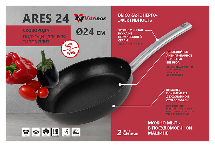 Сковорода Vitrinor Ares 24 используется на предприятиях общественного питания и торговли, а также в домашних условиях для приготовления широкого спектра блюд на любых типах варочных поверхностей, включая индукционные. Модель оснащена эргономичной ручкой с отверстием для подвешивания. Изделие выполнено из стали c ферромагнитными свойствами с двухслойным антипригарным покрытием, не содержащим PFOA, внешнее покрытие - двухслойная стеклоэмаль, обожженная при температуре 820 °С, черного цвета, ручка - из нержавеющей стали. Особенности: