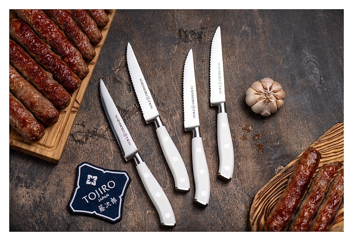 Набор ножей Hatamoto H1401 серии Twin используется на предприятиях общественного питания и в домашних условиях для нарезки готовых стейков, шашлыка, антрекотов, сала и других мясных продуктов в процессе сервировки. Изделия оснащены прямыми заостренными кверху лезвиями и удобными рукоятками. Лезвия выполнены из высококачественной нержавеющей стали AUS-8, рукоятки – из прочного термопластика GRN светло-серого цвета. В комплект поставкм входят 4 ножа и заводская упаковка. Особенности: