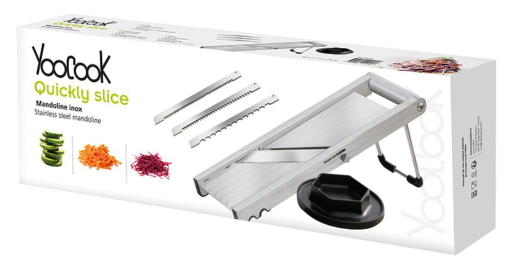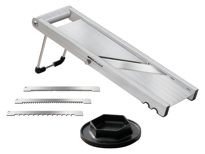 Мандолина Tellier N4292 предназначена для нарезки фруктов и овощей на предприятиях общественного питания и торговли, а также в частных домах и квартирах. Модель оснащена 3 лезвиями, толкателем и нескользящими ножками. Корпус и лезвия выполнены из нержавеющей стали. Дополнительные характеристики:
