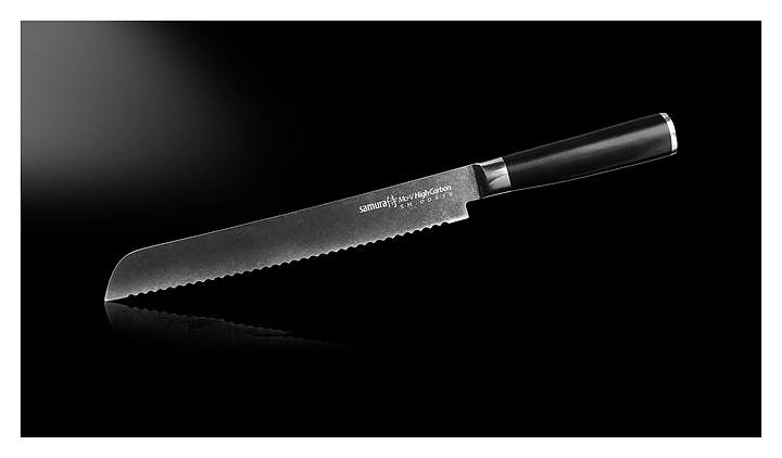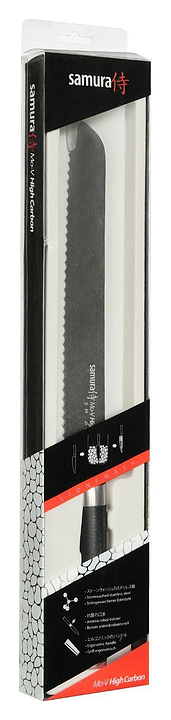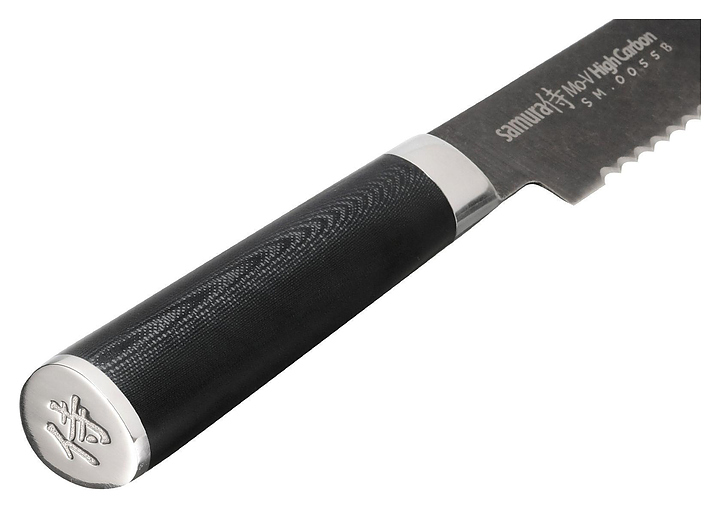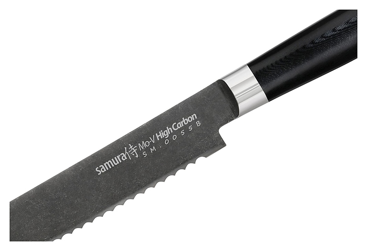 Японский кухонный нож Samura Mo-V Stonewash SM-0055B предназначен для нарезки хлеба и хлебобулочных изделий на предприятиях общественного питания и торговли, в частных домах и квартирах. Волнообразная режущая кромка модели состоит из множества мелких, но очень острых зубчиков, которые легко преодолевают твердую хрустящую корочку сдобы и деликатно разрезают ее пышную мягкую сердцевину. Лезвие выполнено из коррозионно-стойкой однослойной стали AUS-8 и имеет матовую грубую поверхность благодаря обработке методом галтовки, ручка - из стеклоткани G-10. Особенности: