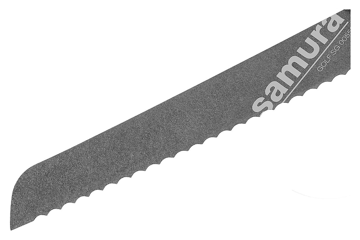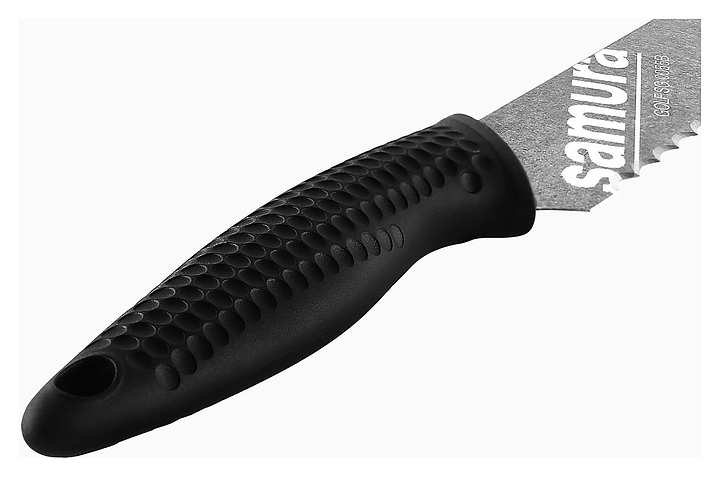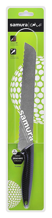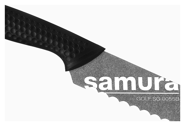 Японский кухонный нож Samura Golf Stonewash SG-0055B предназначен для нарезки хлеба, хлебобулочных изделий, плотных снаружи продуктов с деликатной и сочной сердцевиной, таких как арбузы, дыни, ананасы, цитрусовые, тыква и другие на предприятиях общественного питания и торговли, в частных домах и квартирах. Эргономичная рукоятка стилизована под ребристую поверхность мяча для игры в гольф. Лезвие выполнено из качественной японской специализированной однослойной стали AUS-8 и имеет матовую грубую поверхность благодаря обработке методом галтовки, ручка - из высококачественного полипропилена. Особенности: