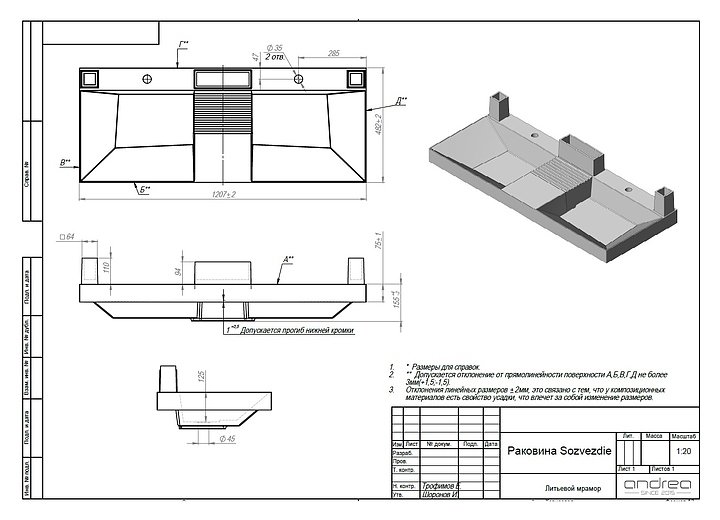 Раковина Andrea Sozvezdie 120 популярной российской компании легко вписывается в интерьер любой ванной комнаты. Модель оснащена 2 чашами и просторной поверхностью для размещения мыла и зубных щеток. Встраиваемая конструкция позволяет экономить место в ванной комнате для хранения туалетных принадлежностей. Изделие выполнено из искусственного мрамора, который отличается высокой прочностью, стойкостью к химическим веществам и высокой температуре, а также имеет гладкую поверхность, а верхний слой гелькоута образует декоративно защитное покрытие. В комплект поставки входит декоративная крышка. Особенности: