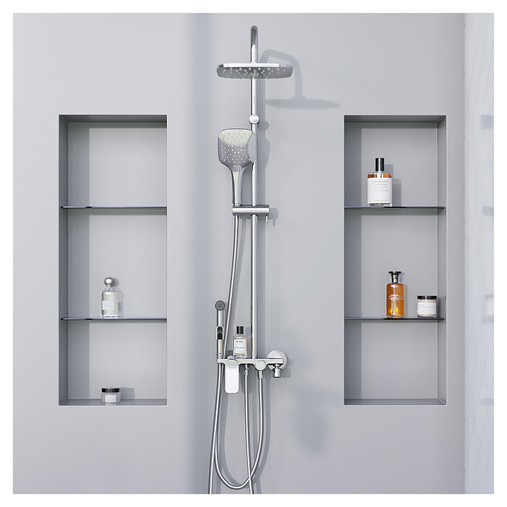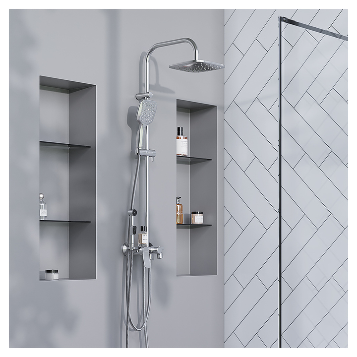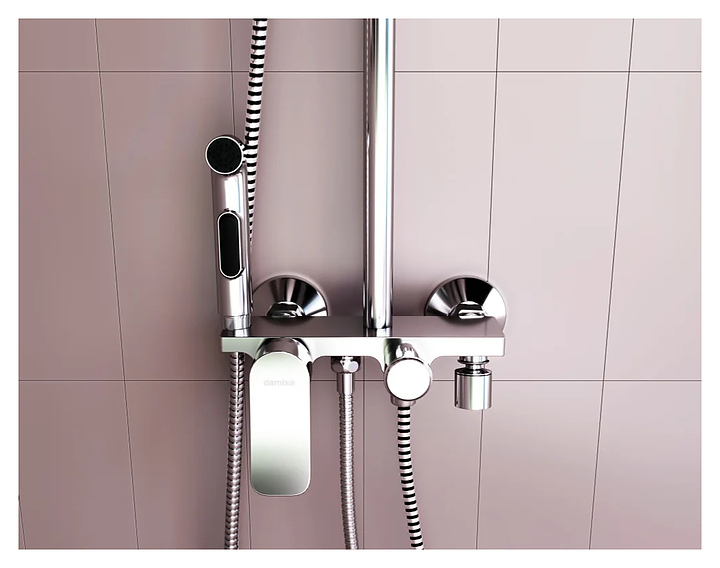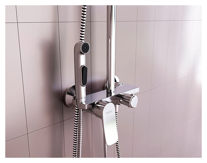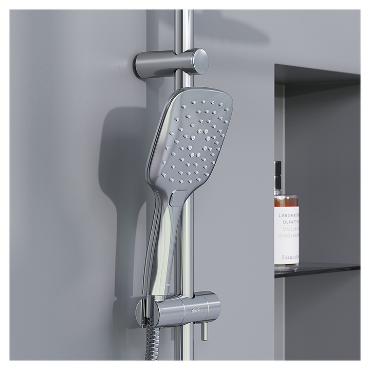 Душевая система Damixa Apollo DX220920000 используется в ванных комнатах. Модель оснащена полкой, квадратным тропическим верхним душем, квадратной ручной лейкой с душевым шлангом и держателем лейки, гигиенической лейкой с шлангом, а также керамическим картриджем, обеспечивающим плавный ход рычага смесителя, контроль и точность при выборе напора и температуры воды. Изделие выполнено из латуни, которая отличается прочностью, долговечностью и устойчивостью к перепадам температур. В комплект поставки входят смеситель для душа, штанга, верхний душ, ручной душ, шланг для ручного душа, гигиеническая лейка со шлангом и переключатель потоков. Особенности: