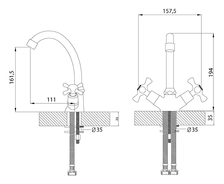 Cмеситель для раковины Rossinka H02-62 предназначен для подачи горячей и холодной воды в ванных помещениях. Модель оснащена керамическими вентильными головками и кран-буксой для бесшумного смешивания. Аэратор с функцией легкой очистки экономит расход воды и снижает количество брызг. Изделие выполнено из латуни, отличающейся прочностью, долговечностью и устойчивостью к перепадам температур, рукоятки - из металла, аэратор - из пластика. В комплект поставки входят 2 гибкие подводки и присоединительная группа для горизонтального крепления. Дополнительные характеристики:
