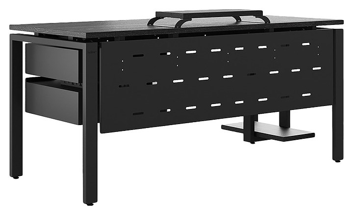 Офисный стол Кобор P-120/80 black/glazed используется в офисных помещениях и кабинетах руководителей. Модель оснащена П-образными опорами. Каркас выполнен из металла, выкрашенного в цвет черный муар (RAL9005), столешница – из ламинированной древесно-стружечной плиты (ЛДСП) цвета черный дуб (H3178 ST37). Опции (заказываются отдельно):