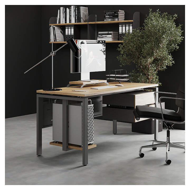 Офисный стол Кобор P-80/60 aluminum/natural используется в офисных помещениях и кабинетах руководителей. Модель оснащена П-образными опорами. Каркас выполнен из металла, выкрашенного в цвет алюминиевый металлик (RAL9006), столешница – из ламинированной древесно-стружечной плиты (ЛДСП) цвета натуральный дуб (H1180 ST37). Опции (заказываются отдельно):