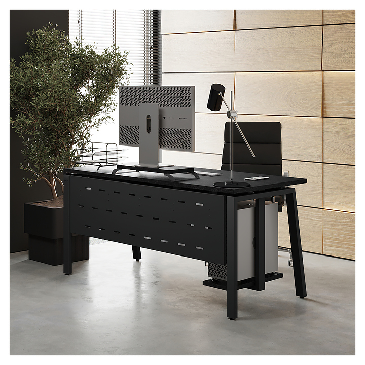 Офисный стол Кобор AB-140/80 black/glazed используется в офисных помещениях и кабинетах руководителей. Модель оснащена A-образными опорами со скошенными фронтальными сегментами. Каркас выполнен из металла, выкрашенного в цвет черный муар (RAL9005), столешница – из ламинированной древесно-стружечной плиты (ЛДСП) цвета черный дуб (H3178 ST37). Опции (заказываются отдельно):