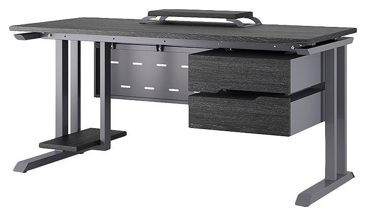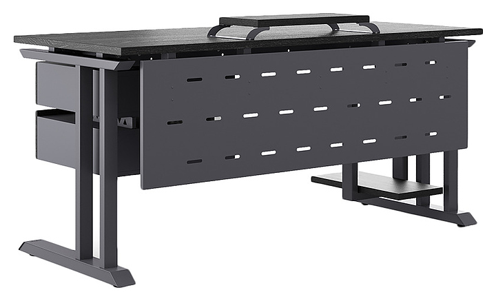 Офисный стол Кобор L1-180/80 graphite/glazed используется в офисных помещениях и кабинетах руководителей. Модель оснащена L-образными опорами. Каркас выполнен из металла, выкрашенного в цвет графит муар (RAL7024), столешница – из ламинированной древесно-стружечной плиты (ЛДСП) цвета черный дуб (H3178 ST37). Опции (заказываются отдельно):