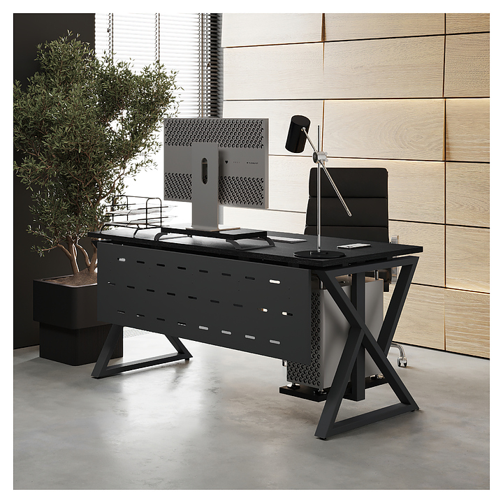 Офисный стол Кобор W-140/80 black/glazed используется в офисных помещениях и кабинетах руководителей. Модель оснащена W-образными опорами. Каркас выполнен из металла, выкрашенного в цвет черный муар (RAL9005), столешница – из ламинированной древесно-стружечной плиты (ЛДСП) цвета черный дуб (H3178 ST37). Опции (заказываются отдельно):