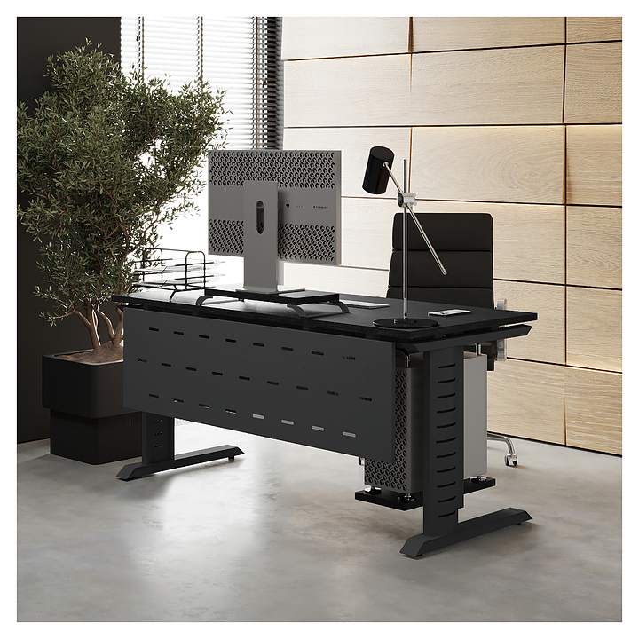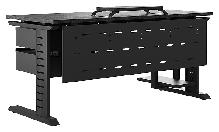 Офисный стол Кобор L2-80/60 black/glazed используется в офисных помещениях и кабинетах руководителей. Модель оснащена L-образными опорами с декоративными вставками на боковинах. Каркас выполнен из металла, выкрашенного в цвет черный муар (RAL9005), столешница – из ламинированной древесно-стружечной плиты (ЛДСП) цвета черный дуб (H3178 ST37). Опции (заказываются отдельно):