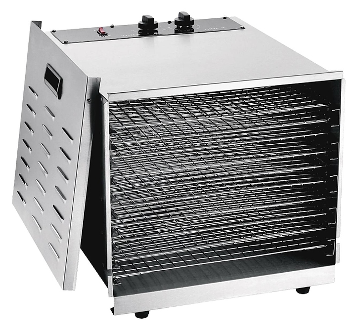 Дегидратор Eksi EKD-10G предназначен для сушки фруктов, овощей и грибов на предприятиях общественного питания и торговли. Модель оснащена цифровой панелью управления, таймером на 4 часа и 10 лотками. Корпус выполнен из нержавеющей стали. Характеристики: