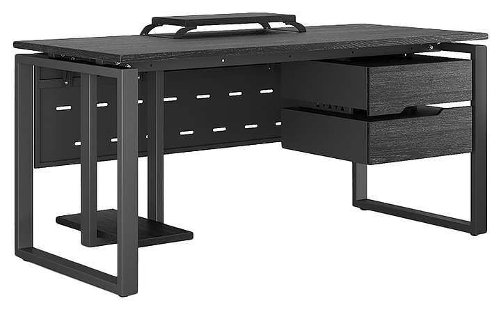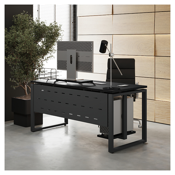 Офисный стол Кобор O1-80/70 black/glazed используется в офисных помещениях и кабинетах руководителей. Модель оснащена O-образными опорами. Каркас выполнен из металла, выкрашенного в цвет черный муар (RAL9005), столешница – из ламинированной древесно-стружечной плиты (ЛДСП) цвета черный дуб (H3178 ST37). Опции (заказываются отдельно):