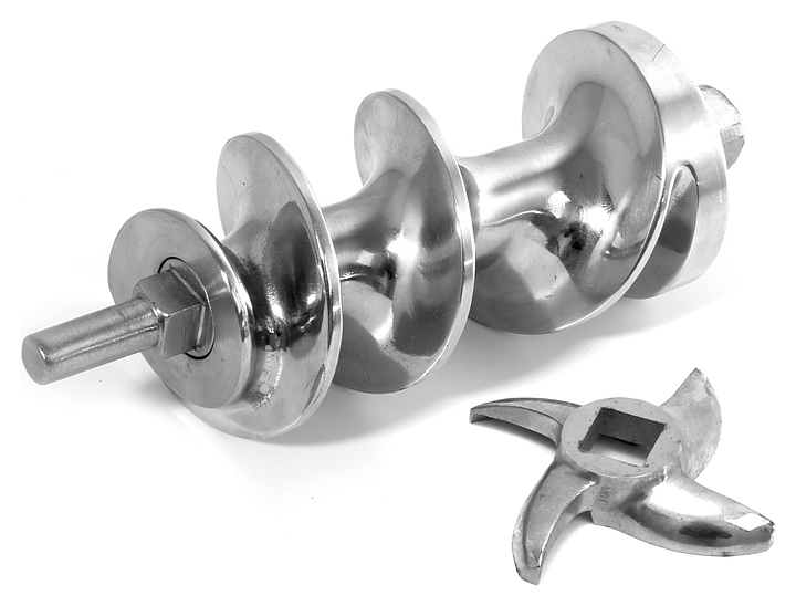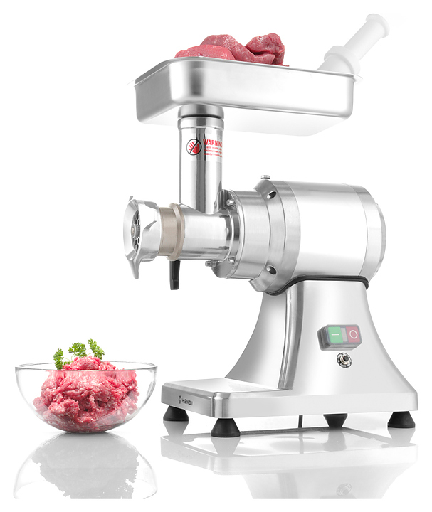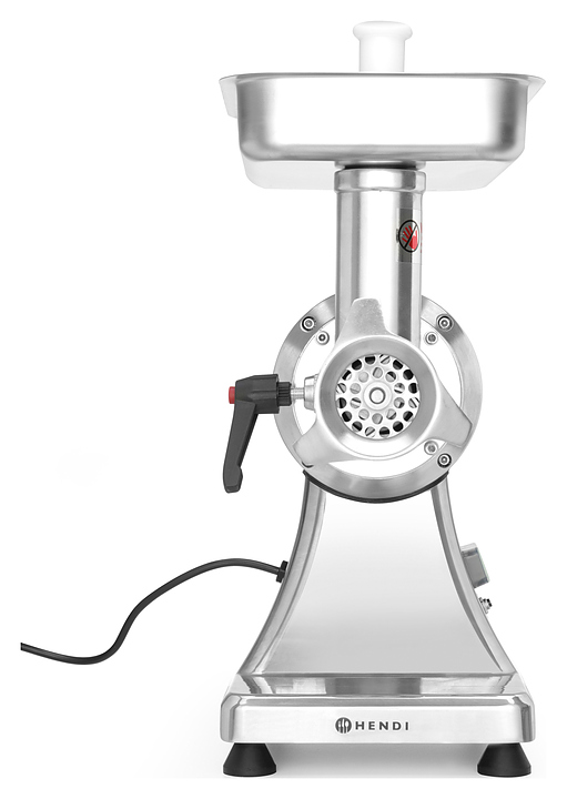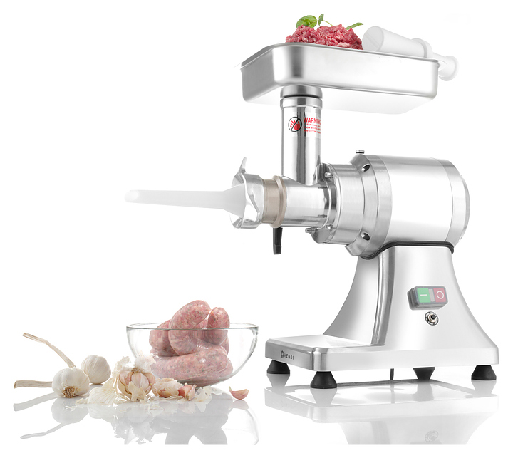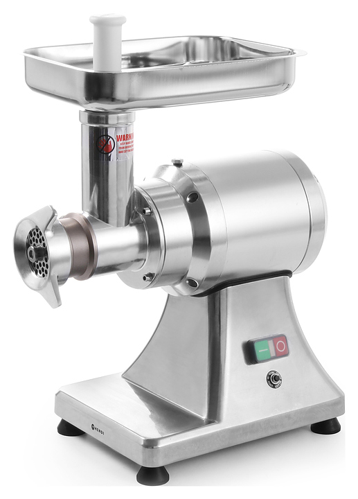 Мясорубка HENDI Kitchen Line 12 210802 используется в частных домах и квартирах для измельчения мяса и рыбы при производстве фарша. Модель оснащена мощным двигателем и нескользящими ножками. Нож, шнек и загрузочный лоток выполнены из нержавеющей стали, бункер - из алюминиевого сплава, толкатель - из полиэтилена, воронка - из полированного алюминиевого сплава, насадка для колбасы - из полипропилена. В комплект поставки входят 2 решетки и насадка. Особенности: