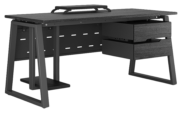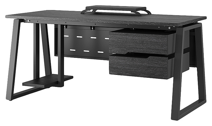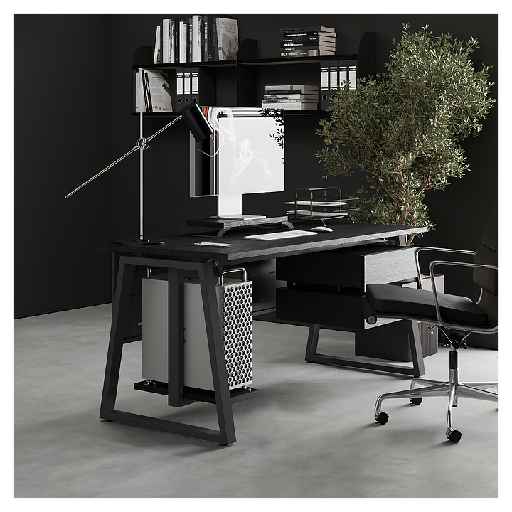 Офисный стол Кобор TR-140/60 black/glazed используется в офисных помещениях и кабинетах руководителей. Модель оснащена опорами в форме трапеции. Каркас выполнен из металла, выкрашенного в цвет черный муар (RAL9005), столешница – из ламинированной древесно-стружечной плиты (ЛДСП) цвета черный дуб (H3178 ST37). Опции (заказываются отдельно):