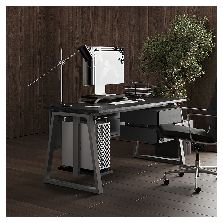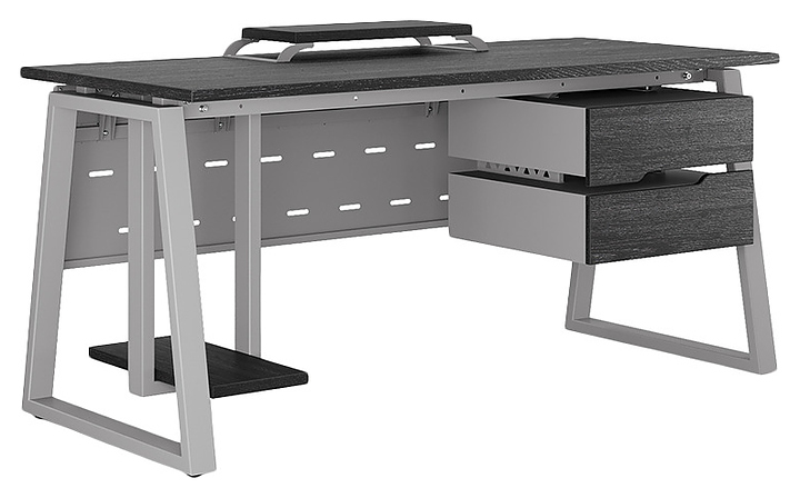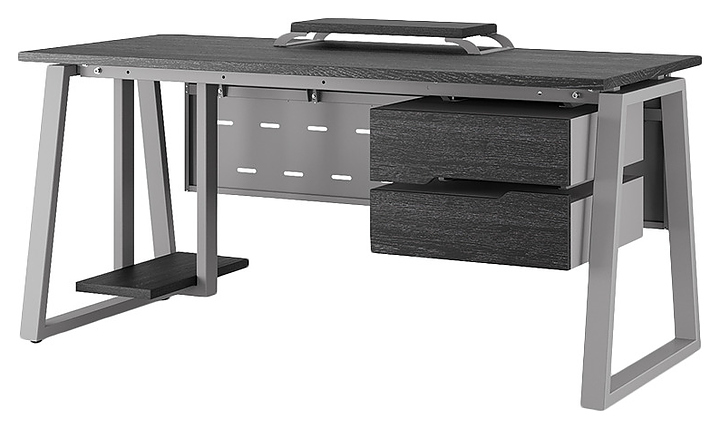 Офисный стол Кобор TR-100/80 aluminum/glazed используется в офисных помещениях и кабинетах руководителей. Модель оснащена опорами в форме трапеции. Каркас выполнен из металла, выкрашенного в цвет алюминиевый металлик (RAL9006), столешница – из ламинированной древесно-стружечной плиты (ЛДСП) цвета черный дуб (H3178 ST37). Опции (заказываются отдельно):
