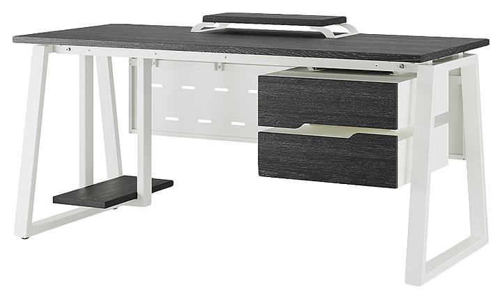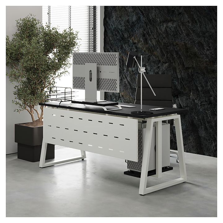 Офисный стол Кобор TR-80/60 white/glazed используется в офисных помещениях и кабинетах руководителей. Модель оснащена опорами в форме трапеции. Каркас выполнен из металла, выкрашенного в цвет белый муар (RAL9016), столешница – из ламинированной древесно-стружечной плиты (ЛДСП) цвета черный дуб (H3178 ST37). Опции (заказываются отдельно):