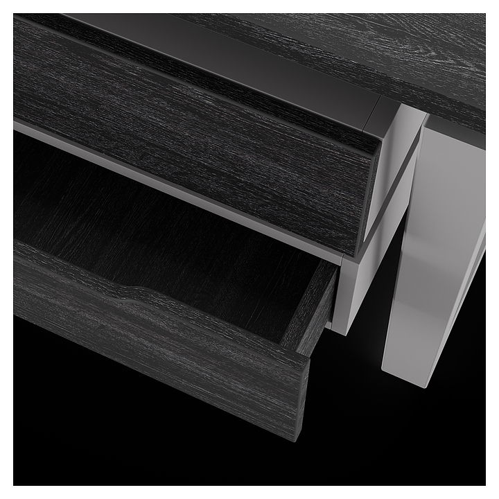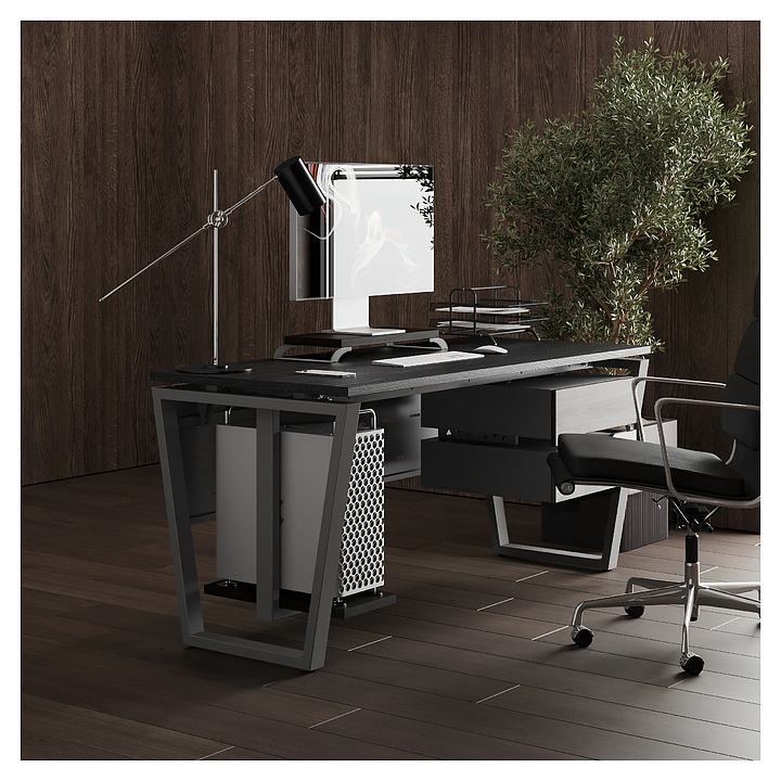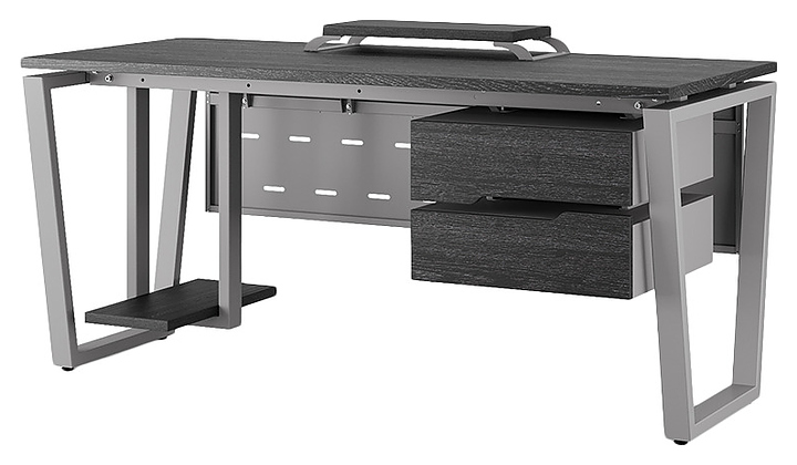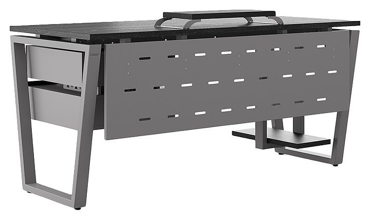 Офисный стол Кобор OTR-120/60 aluminum/glazed используется в офисных помещениях и кабинетах руководителей. Модель оснащена опорами в форме обратной трапеции. Каркас выполнен из металла, выкрашенного в цвет алюминиевый металлик (RAL9006), столешница – из ламинированной древесно-стружечной плиты (ЛДСП) цвета черный дуб (H3178 ST37). Опции (заказываются отдельно):