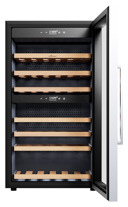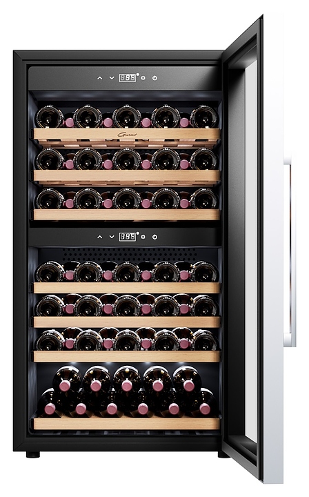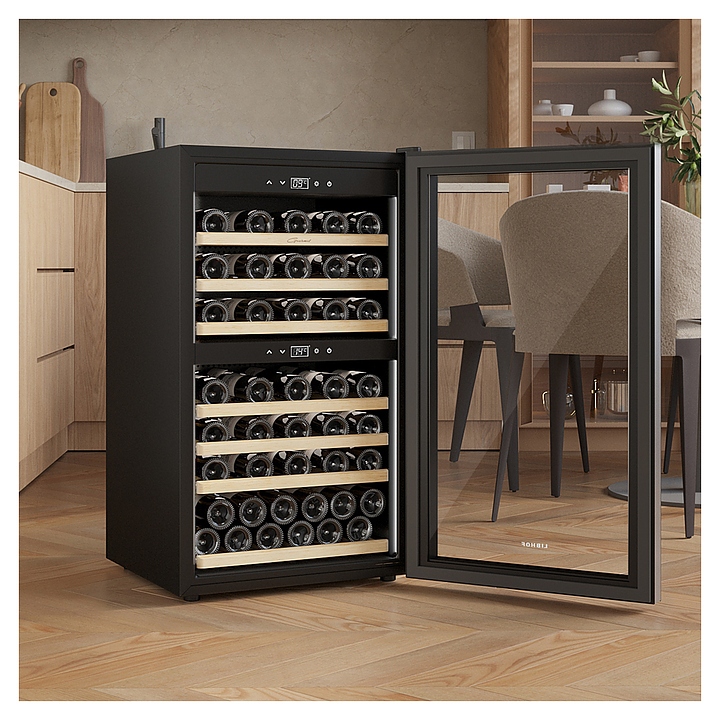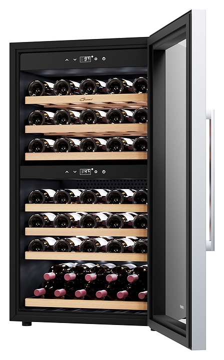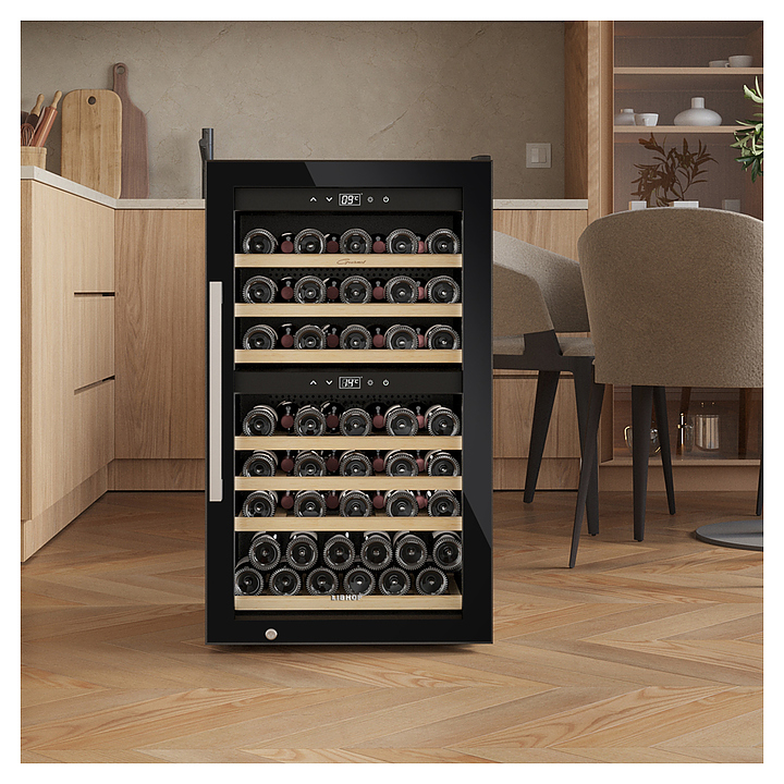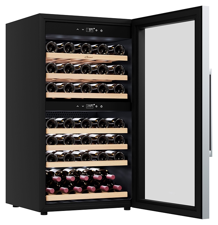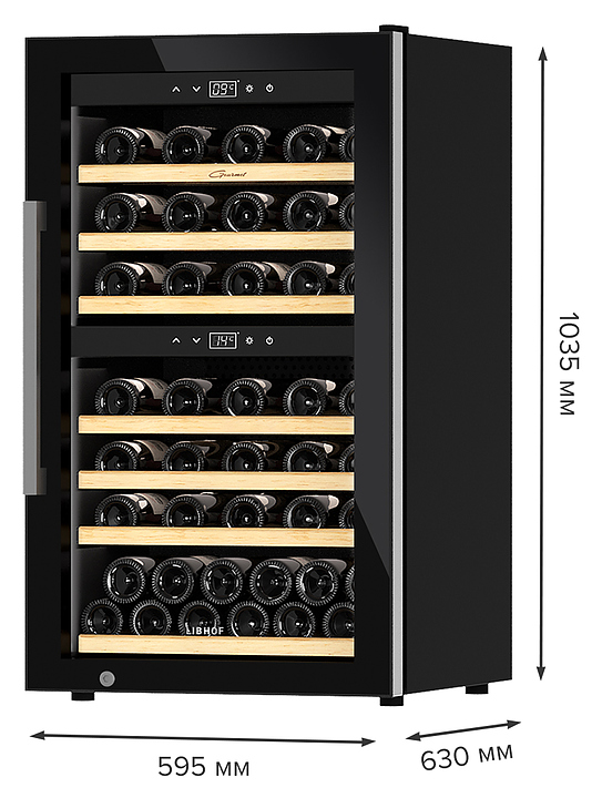 Винный шкаф Libhof Gourmet GQD-66 Black предназначен для хранения при оптимальных условиях бутилированного вина различных сортов в барах, ресторанах, специализированных магазинах, подсобных складских помещениях, а также в домашних условиях. Модель оснащена холодильной камерой с 2 независимыми температурными зонами, распашной дверью на скрытых внутренних петлях, длинной вертикальной рукояткой, прозрачным обзорным стеклом, внутренней сенсорной панелью управления и цифровым дисплеем с белой подсветкой индикации. Корпус выполнен из металла с антикоррозийным покрытием черного цвета, боковой профиль рамы двери и рукоятка – из металла с серебристой поверхностью, полки – из массива буковой древесины. В комплект поставки входят 7 полок с направляющими для размещения бутылок, крепеж для рукоятки, инструкция по эксплуатации и гарантийный талон. Особенности:
