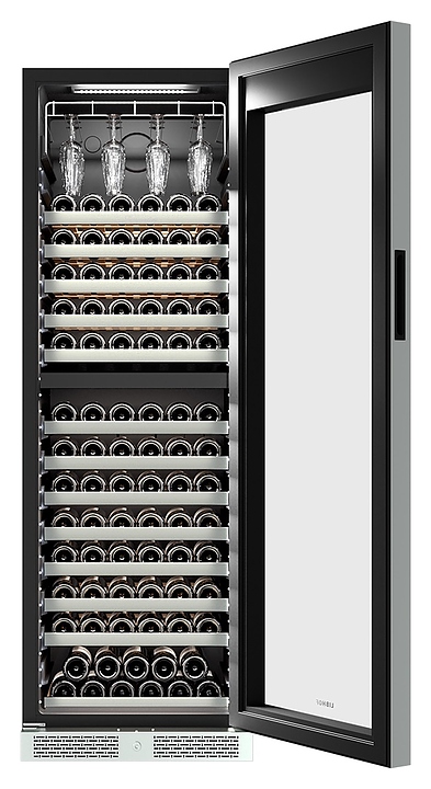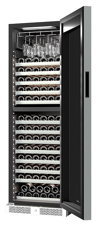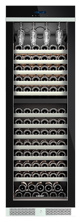 Винный шкаф Libhof Sommelier SQD-165 Black предназначен для хранения при оптимальных условиях бутилированного вина различных сортов в барах, ресторанах, специализированных магазинах, подсобных складских помещениях, а также в домашних условиях. Модель оснащена холодильной камерой с 2 независимыми температурными зонами, запираемой на ключ распашной дверью на скрытых внутренних петлях, прозрачным обзорным стеклом, внешней сенсорной панелью управления и цифровым дисплеем с синей подсветкой индикации. Корпус выполнен из металла с антикоррозийным покрытием черного цвета, цокольная решетка и верхняя фронтальная горизонтальная вставка – из металла с серебристой поверхностью, полки – из массива буковой древесины с серебристым фронтом, подвес для бокалов – из стали. В комплект поставки входят 12 полок с направляющими для бутылок, 2 ключа от дверного замка и инструкция по эксплуатации. Особенности: