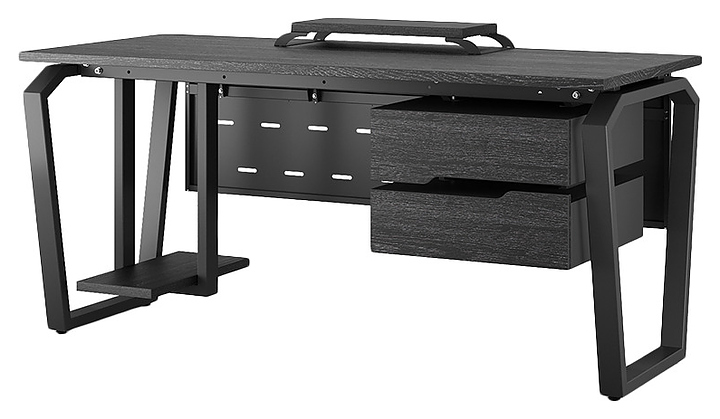 Офисный стол Кобор TB-100/80 black/glazed используется в офисных помещениях и кабинетах руководителей. Модель оснащена опорами в форме обратной трапеции со скошенными верхними углами. Каркас выполнен из металла, выкрашенного в цвет черный муар (RAL9005), столешница – из ламинированной древесно-стружечной плиты (ЛДСП) цвета черный дуб (H3178 ST37). Опции (заказываются отдельно):