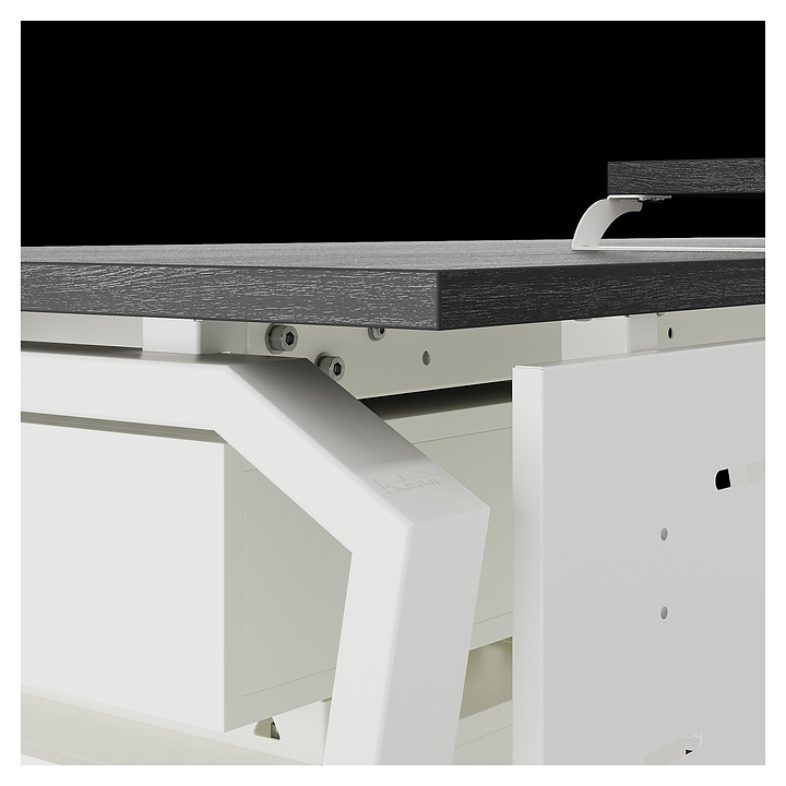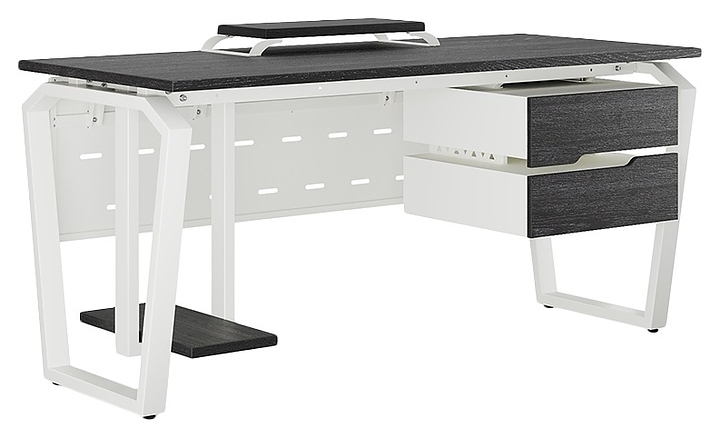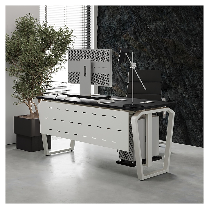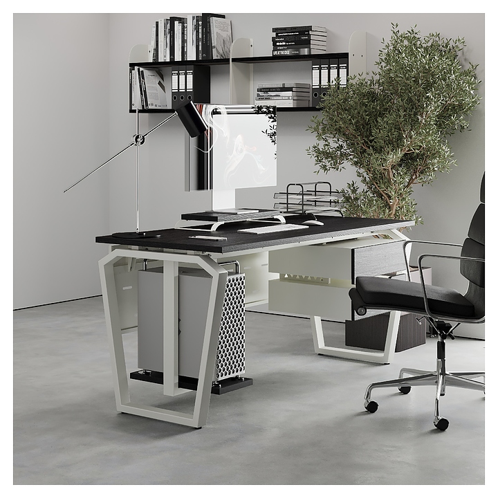 Офисный стол Кобор TB-80/60 white/glazed используется в офисных помещениях и кабинетах руководителей. Модель оснащена опорами в форме обратной трапеции со скошенными верхними углами. Каркас выполнен из металла, выкрашенного в цвет белый муар (RAL9016), столешница – из ламинированной древесно-стружечной плиты (ЛДСП) цвета черный дуб (H3178 ST37). Опции (заказываются отдельно):