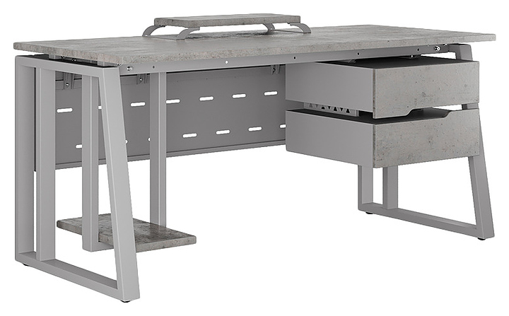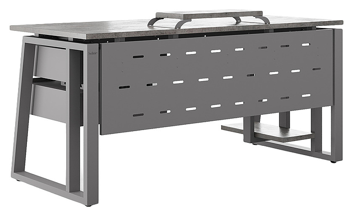Офисный стол Кобор TS2-140/60 aluminum/chicago используется в офисных помещениях и кабинетах руководителей. Модель оснащена усиленными вертикальными балками опорами в форме наклонной трапеции. Каркас выполнен из металла, выкрашенного в цвет алюминиевый металлик (RAL9006), столешница – из ламинированной древесно-стружечной плиты (ЛДСП) цвета бетон чикаго (F186 ST9). Опции (заказываются отдельно):