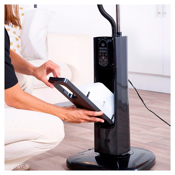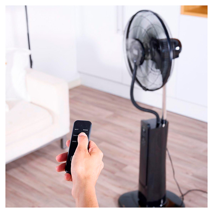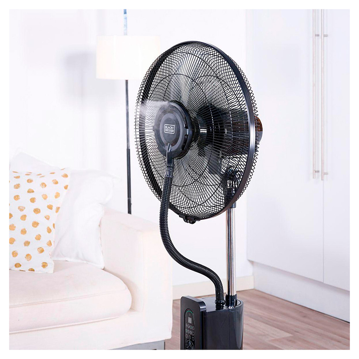 Вентилятор Black+Decker BXMF75E предназначен для улучшения микроклимата путем создания направленной циркуляции воздушных потоков в офисах, гостиничных номерах, помещениях различных учреждений, а также домашних условиях. Модель оснащена 3-лопастным пропеллером, кабелем питания с вилкой и панелью управления с функциональными сенсорными клавишами и светодиодным цифровым дисплеем, пульт – мембранной клавиатурой. Основание и вертикально ориентированный корпус подставки выполнены из ударопрочного черного пластика, опорная стойка – из трубчатого металлического профиля, лопасти – из металла, корпус пульта прямоугольной формы – из черного полимера. В комплект поставки входят инфракрасный пульт дистанционного управления и съемный резервуар для воды с завинчивающимся колпачком. Особенности: