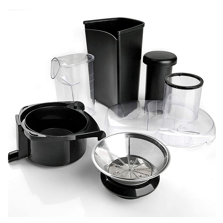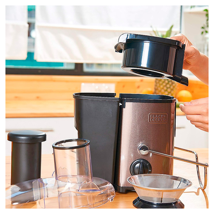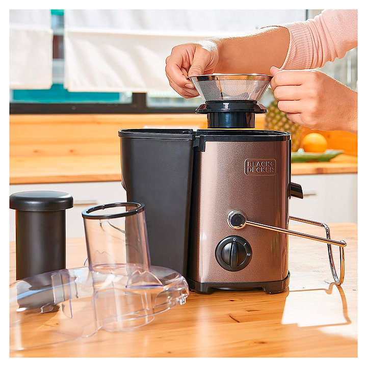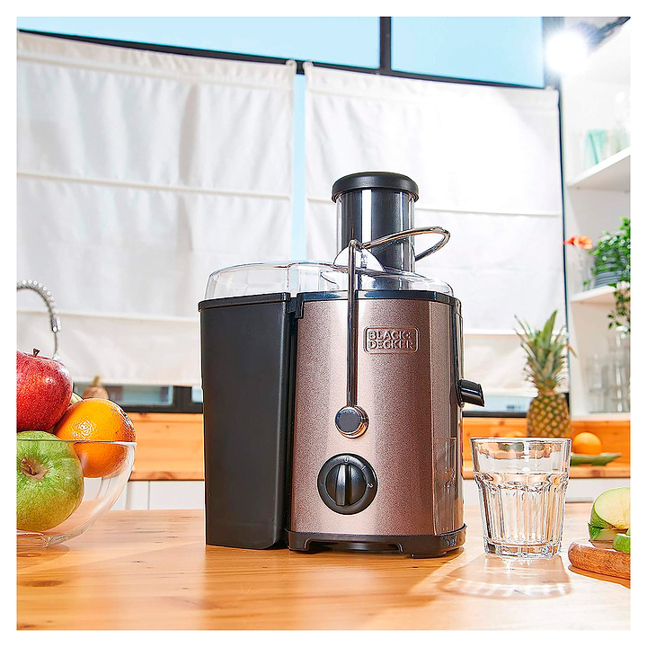 Универсальная соковыжималка Black+Decker BXJE600E предназначена для приготовления свежих соков из различных овощей и фруктов в гостиницах, офисах, а также домашних условиях. Модель оснащена кабелем питания с вилкой, электромеханическим управлением и съемными компонентами: крышкой с загрузочной горловиной, толкателем, сепаратной чашей, фильтром, резервуарами для сока и отходов. Корпус выполнен из нержавеющей стали c защитой поверхности от отпечатков пальцев, фильтр – из нержавеющей стали, съемные компоненты – из пластика. Особенности: