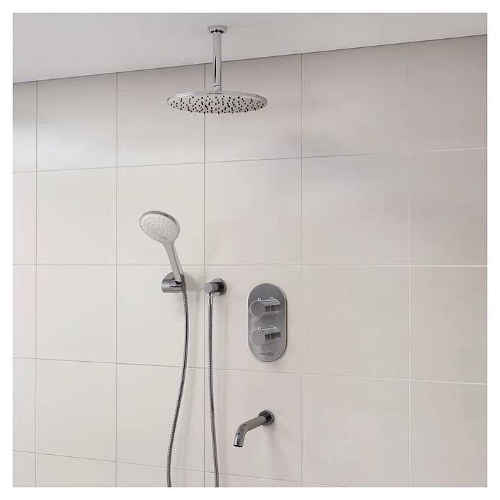 Встраиваемый душевой комплект Wasserkraft A174868 Thermo используется в ванных комнатах. Модель оснащена круглым верхним тропическим душем, потолочным кронштейном для верхнего душа, трехрежимным ручным душем с душевым шлангом и поворотным настенным держателем, изливом, смесителем, а также термостатическим картриджем, обеспечивающим поддержание необходимой температуры в независимости от давления воды. Изделие выполнено из латуни, отличающейся прочностью, долговечностью и устойчивостью к перепадам температур. В комплект поставки входит скрытая часть для установки. Комплектация:
