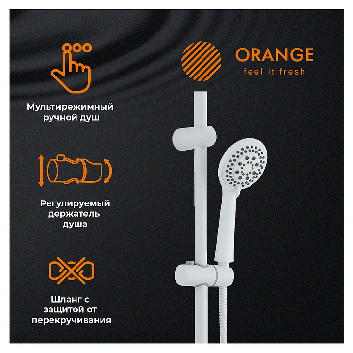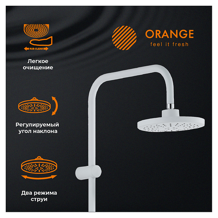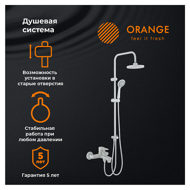 Душевая система ORANGE M19-933w предназначена для использования в ванных помещениях для подачи горячей и холодной воды. Модель оснащена смесителем для ванны, круглым верхним тропическим душем с силиконовыми наконечниками для простого удаления известкового налёта, штангой, регулируемым держателем для ручного душа, круглой ручной лейкой с системой защиты от известковых отложений и душевым шлангом в металлической оплётке с защитой от перекручивания. Керамический картридж обеспечивает плавный ход рычага смесителя, контроль и точность при выборе напора и температуры воды, а аэратор создает мягкую ровную струю без разбрызгивания. Изделие выполнено из латуни, отличающейся прочностью, долговечностью и устойчивостью к перепадам температур. Особенности: