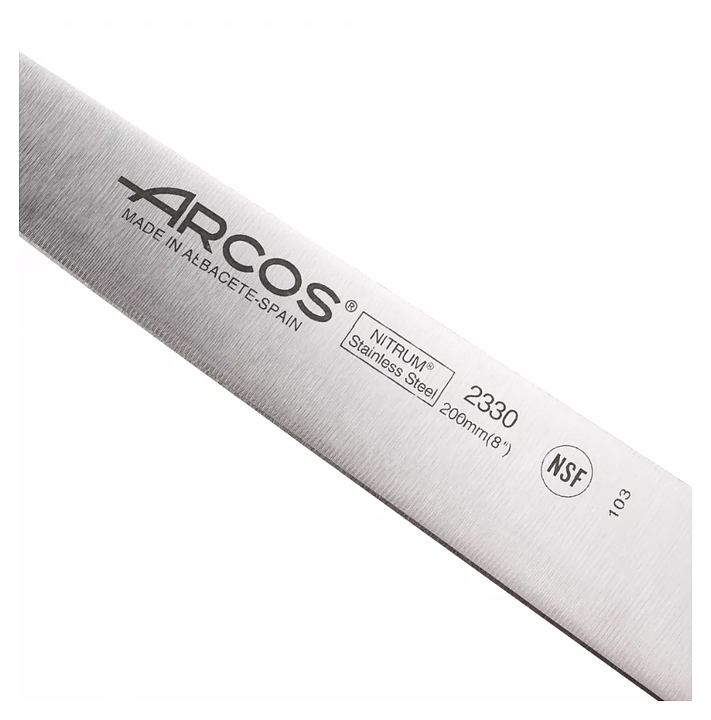 Нож для нарезки ARCOS Riviera Blanca 233024W используется на предприятиях общественного питания и торговли, а также в частных домах и квартирах. Кованое лезвие изготовлено из высококачественной нержавеющей стали NITRUM, эргономичная ручка - из полиоксиметилена. Особенности: