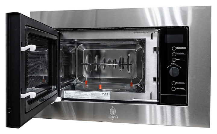 Микроволновая печь Jacky's JM BI20A1 предназначена для приготовления пищи, подогрева готовых блюд и ингридиентов, а также размораживания полуфабрикатов в домашних условиях. Модель оснащена грилем, кабелем питания с вилкой, распашной дверью со смотровым окном, расположенной справа панелью управления с поворотным регулятором, функциональными клавишами и светодиодным цифровым дисплеем с подсветкой индикации белого цвета. Корпус выполнен из высококачественной стали, фронт с покрытием черного цвета и остеклением без винтового крепежа, рамка по периметру фронта – из нержавеющей стали, внутренняя облицовка камеры – из жаропрочной нержавеющей стали, стол – из ударопрочного стекла. В комплект поставки входят роликовое кольцо, поворотный стол и высокая решетка для гриля. Особенности: