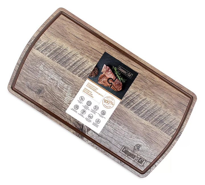 Сервировочная доска ComposeEat DSJ37210634KL6 выполнена из бумажного композитного материала, сохраняющего целостность при падении, ударах и механической нагрузке, устойчивого к резким перепадам температур, не подверженному деформации, выцветанию, сколам, трещинам и механическим повреждениям. Модель оснащена желобом для слива жидкости и нескользящими силиконовыми ножками. Особенности: