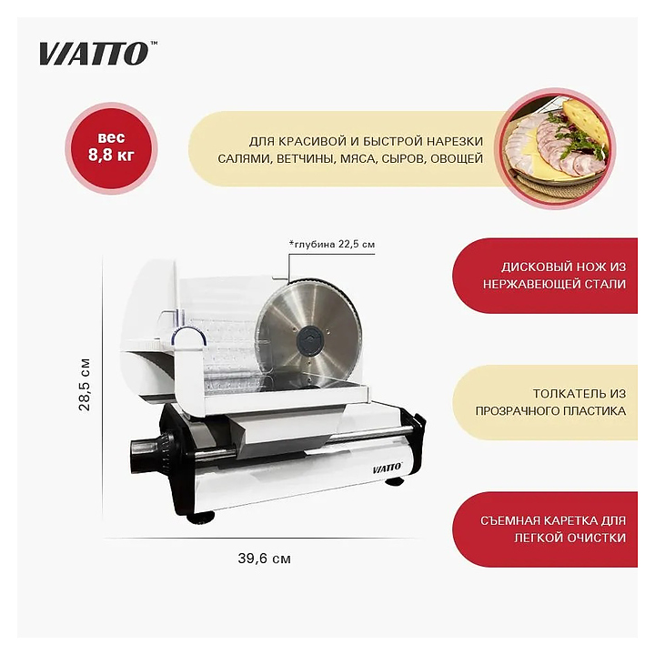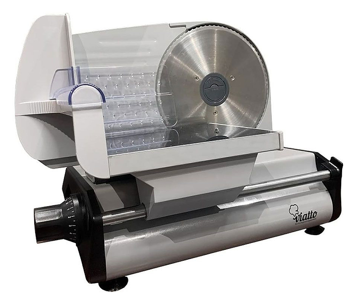 Слайсер VIATTO VA-MS1918W используется на предприятиях общественного питания и торговли для нарезки мяса, сыра, колбасных изделий и других продуктов питания на ровные и равные ломтики. Модель оснащена съемной кареткой, значительно облегчающей процесс очистки, толкателем из прозрачного пластика и резиновыми ножками, предотвращающими скольжение. Корпус выполнен из алюминия и пластика. Информация о товарах, размещенная на сайте, не является публичной офертой, определяемой положениями ст. 405 Гражданского кодекса Республики Беларусь. Производители вправе вносить изменения в технические характеристики, внешний вид и комплектацию товаров без предварительного уведомления. Уточняйте характеристики у наших менеджеров перед оформлением заказа |
