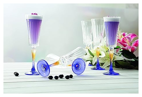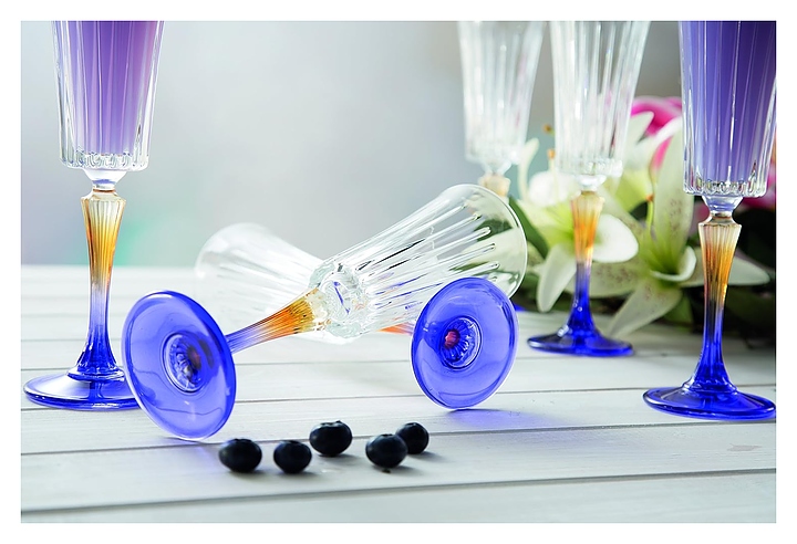 Бокал флюте RCR Cristalleria Style Gipsy 26321020006 используется в барах, ресторанах, на других предприятиях общественного питания и в домашних условиях для подачи шампанского и коктейлей. Модель оснащена фигурной ножкой на круглом основании, высокой чашей с плоским донышком и расширенным кверху изогнутым бортом с декоративным рельефом в виде вертикальных лучей на внешней поверхности. Изделие выполнено из высококачественного хрустального стекла, элементы опоры с тонировкой в комбинации оранжевого и фиолетового цветов. Особенности: