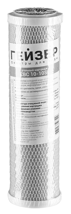 Картридж для фильтра ГЕЙЗЕР CBC 10 - 10SL (К) предназначен для совместного использования с фильтрами стандарта Slim Line 10" для очистки холодной воды от хлора, органических, хлорорганических соединений, пестицидов, нефтепродуктов и фенола. Удаляет цвет и запах, улучшает вкус воды. В состав картиджа входит активированный уголь. Дополнительные характеристики: