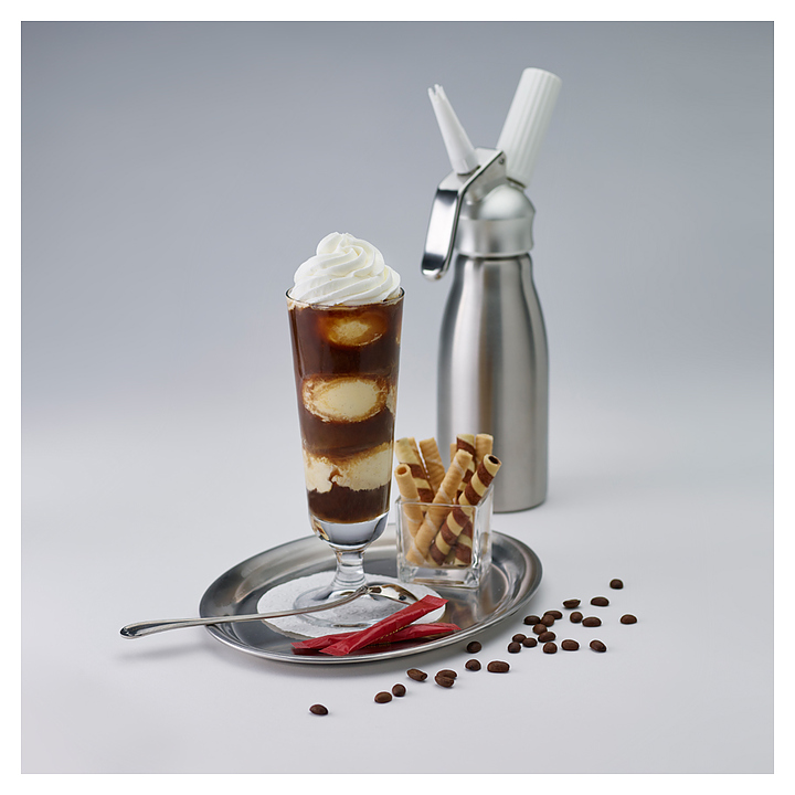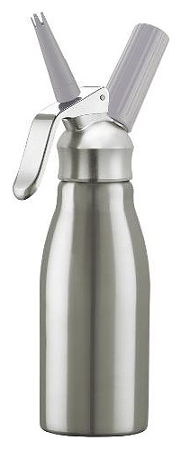 Сифон для взбивания сливок Kayser Symphonie 4510 предназначен для приготовления разнообразных легких десертов: кремов, муссов, суфле, а также пюре и соусов в домашних условиях. Модель состоит из колбы для ингридиентов и завинчивающейся головной части с патроном для баллончика со сжиженным газом, входным и выходным клапанами и удобной рукояткой. Принцип работы: сжиженный газ из баллончика под давлением поступает в колбу, расширяется и насыщает содержимое, в результате продукт увеличивается в объеме и приобретает пенистую структуру. Колба выполнена из нержавеющей стали, головная часть – из алюминия. Особенности: