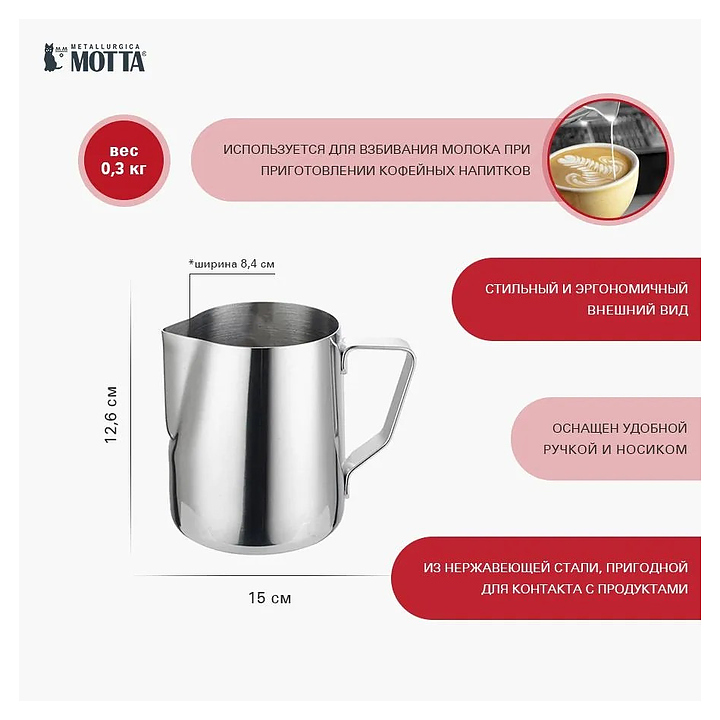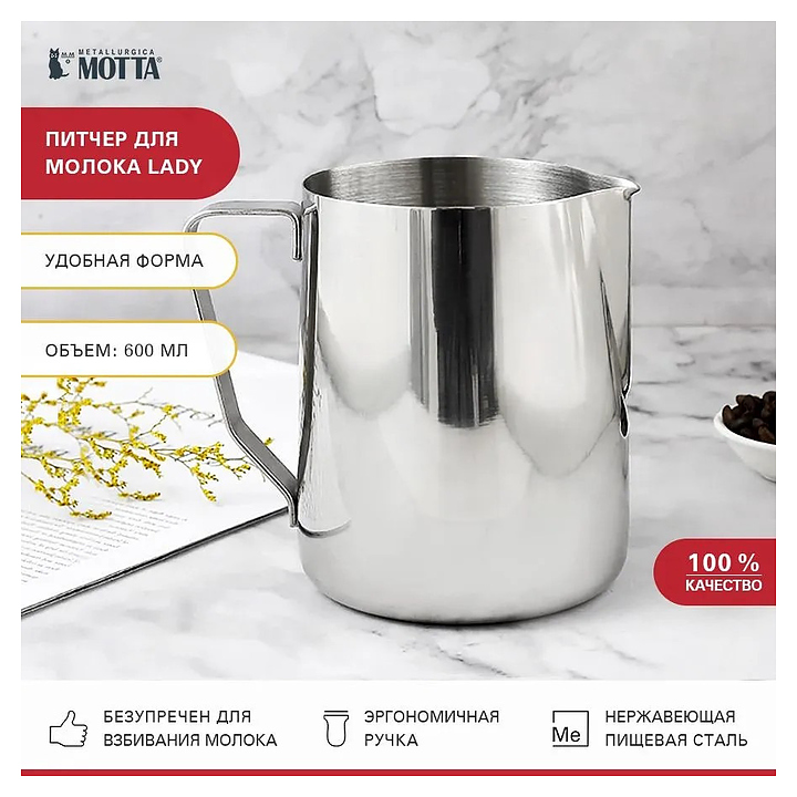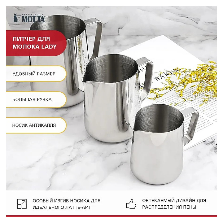 Питчер MOTTA 08960/00 Lady используется совместно с кофемашинами и кофеварками на предприятиях общественного питания и торговли, в частных домах и квартирах для подачи молока или сливок, а также приготовления напитков с добавлением эспрессо. Изделие выполнено из нержавеющей стали, пригодной для контакта с продуктами. Дополнительные характеристики: