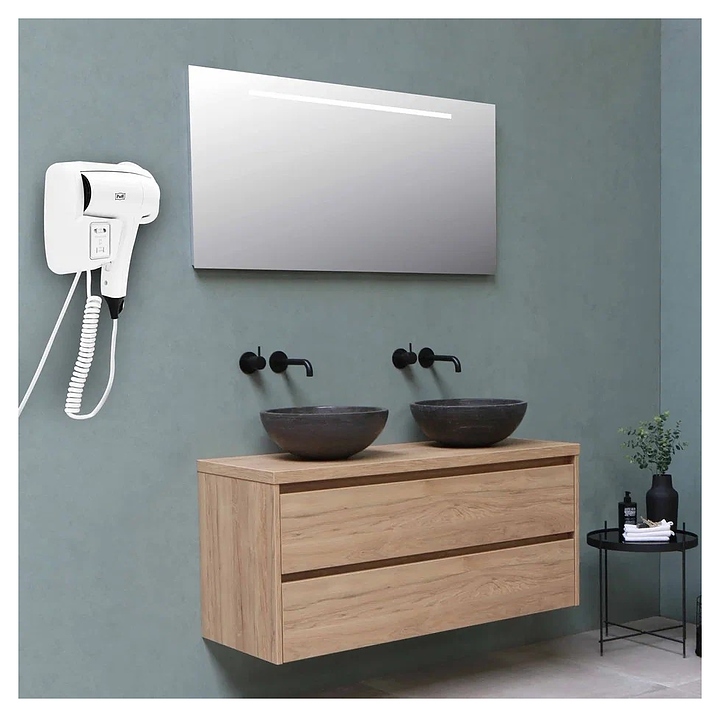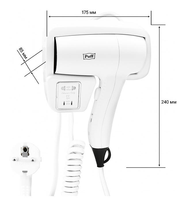 Настенный фен Puff 1201B предназначен для быстрой сушки и комфортной укладки в спорткомплексах, фитнес-центрах, бассейнах, отелях, гостиницах, частных домах и квартирах. Модель оснащена 2 режимами сушки по температуре и дополнительной электророзеткой. Корпус выполнен из ударопрочного ABS-пластика. В комплект поставки входят крепления. Особенности: