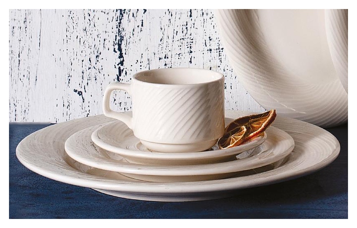 Тарелка Porland 185923 серии Storm предназначена для профессионального использования на предприятиях общественного питания. Декор изделия отличается уникальным дизайном с плавными волнообраными линиями. Посуда изготавливается по запатентованной технологии Alumilite с добавлением оксида алюминия, что делает ее устойчивой к сколам, механическим и термическим воздействиям. Изделие выполнено из твердого фарфора и покрыто высококачественной тугоплавкой глазурью Feldspatic. Особенности: