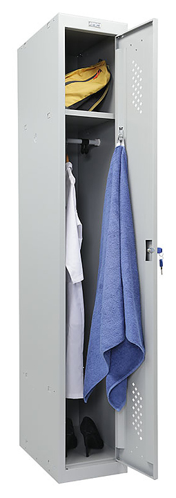 Шкаф для одежды ПРОМЕТ Практик Усиленный ML-11-30 используется на предприятиях общественного питания и торговли, а также в производственных помещениях для хранения одежды и личных вещей персонала. Модель оснащена запираемой на ключ распашной дверцей, полкой, перекладиной и крючками. Корпус выполнен из стали, окрашенной методом порошкового напыления. Особенности: