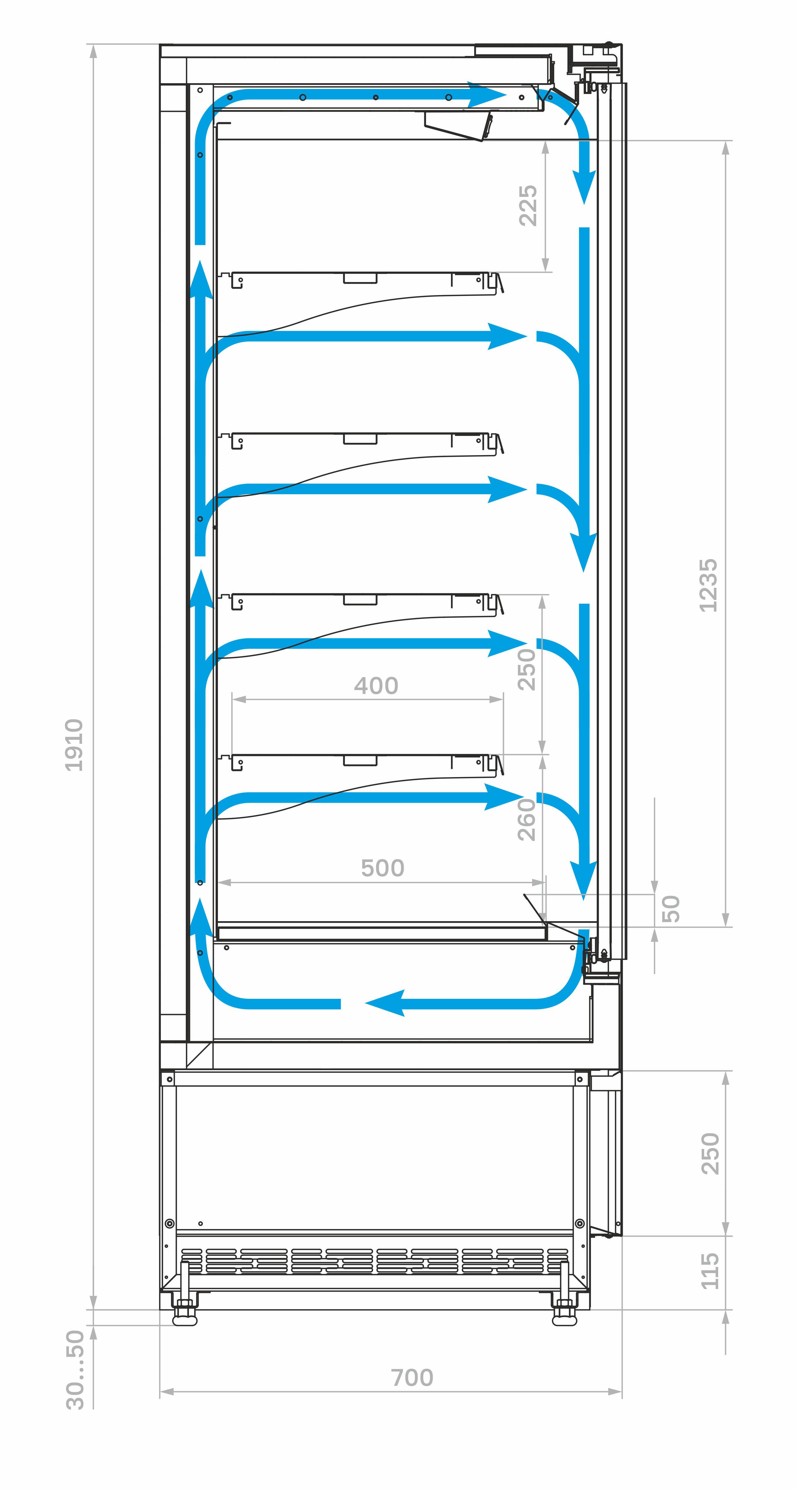Холодильная горка Carboma FC 20-07 VV 2,5-1 версия 2.0 Standard серии Cube 2 используется на предприятиях общественного питания и торговли для охлаждения, кратковременного хранения и предпродажной демонстрации напитков, мяса, птицы, полуфабрикатов, молочных и гастрономических изделий. Модель оснащена 4 рядами навесных полок с кронштейнами, 4 распашными дверьми с рукоятками по всей длине створок, подставкой с фронтальной термовыводящей и цокольной решетками. Корпус прямоугольно ориентированной формы выполнен из стали с антикоррозийным покрытием внешних панелей, полок и кронштейнов цвета нержавеющая сталь (RAL 0430), цоколя и интерьера черного цвета (RAL 9005), теплоизоляция – из пенополиуретана. Особенности: