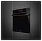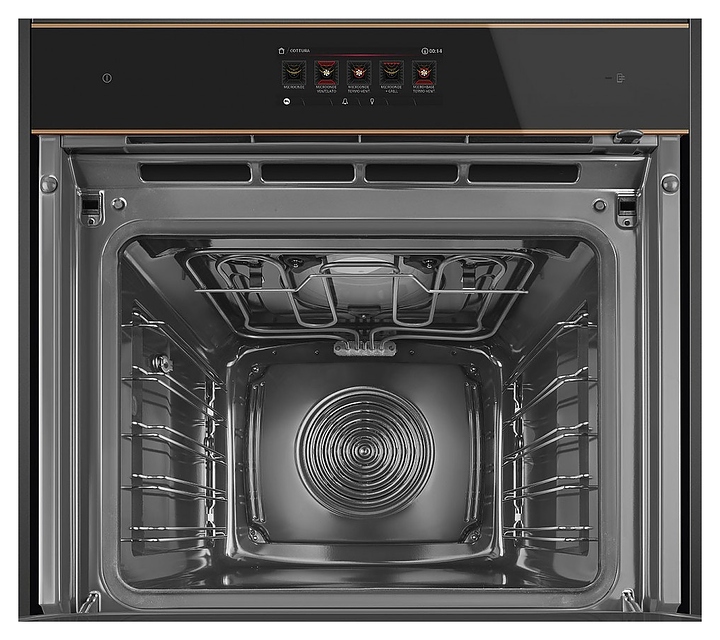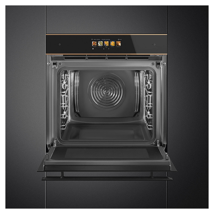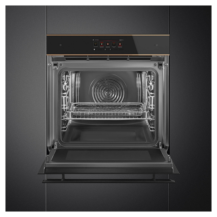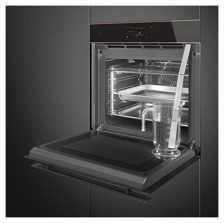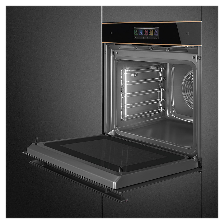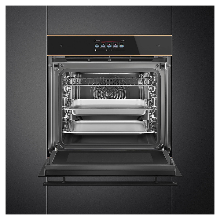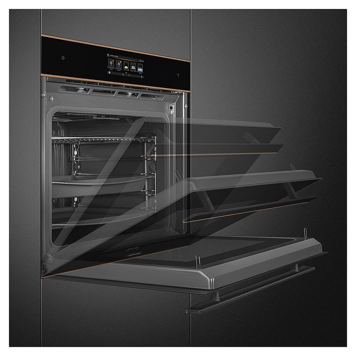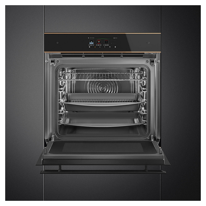 Электрический духовой шкаф SMEG SO6606WAPNR предназначен для приготовления большого ассортимента блюд в домашних условиях. Модель оснащена рабочей камерой GALILEO с верхним и нижним нагревательными элементамии, грилем, расположенными в задней стенке кольцевым нагревателем и вентилятором, магнетроном, парогенератором, 2 съемными стойками с 5 уровнями направляющих для противней, откидной дверью со смотровым окном и длинной горизонтальной рукояткой, сенсорным управлением с TFT-дисплеем (VIVO Screen Max). Корпус выполнен из высококачественной стали, фронт черного цвета с полным глянцевым тонированным остеклением Eclipse без винтового крепежа и декором горизонтальными медными вставками, направляющие с хромированным покрытием.
