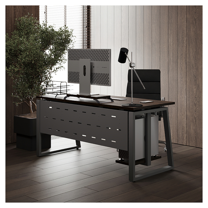 Компьютерный стол Кобор KTS1-100/80 aluminum/charlston используется в офисных помещениях и кабинетах руководителей. Модель оснащена опорами в форме наклонной трапеции. Каркас выполнен из металла, выкрашенного в цвет алюминиевый металлик (RAL9006), столешница – из ламинированной древесно-стружечной плиты (ЛДСП) цвета дуб чарльстон (H3154 ST36). Опции (заказываются отдельно):
