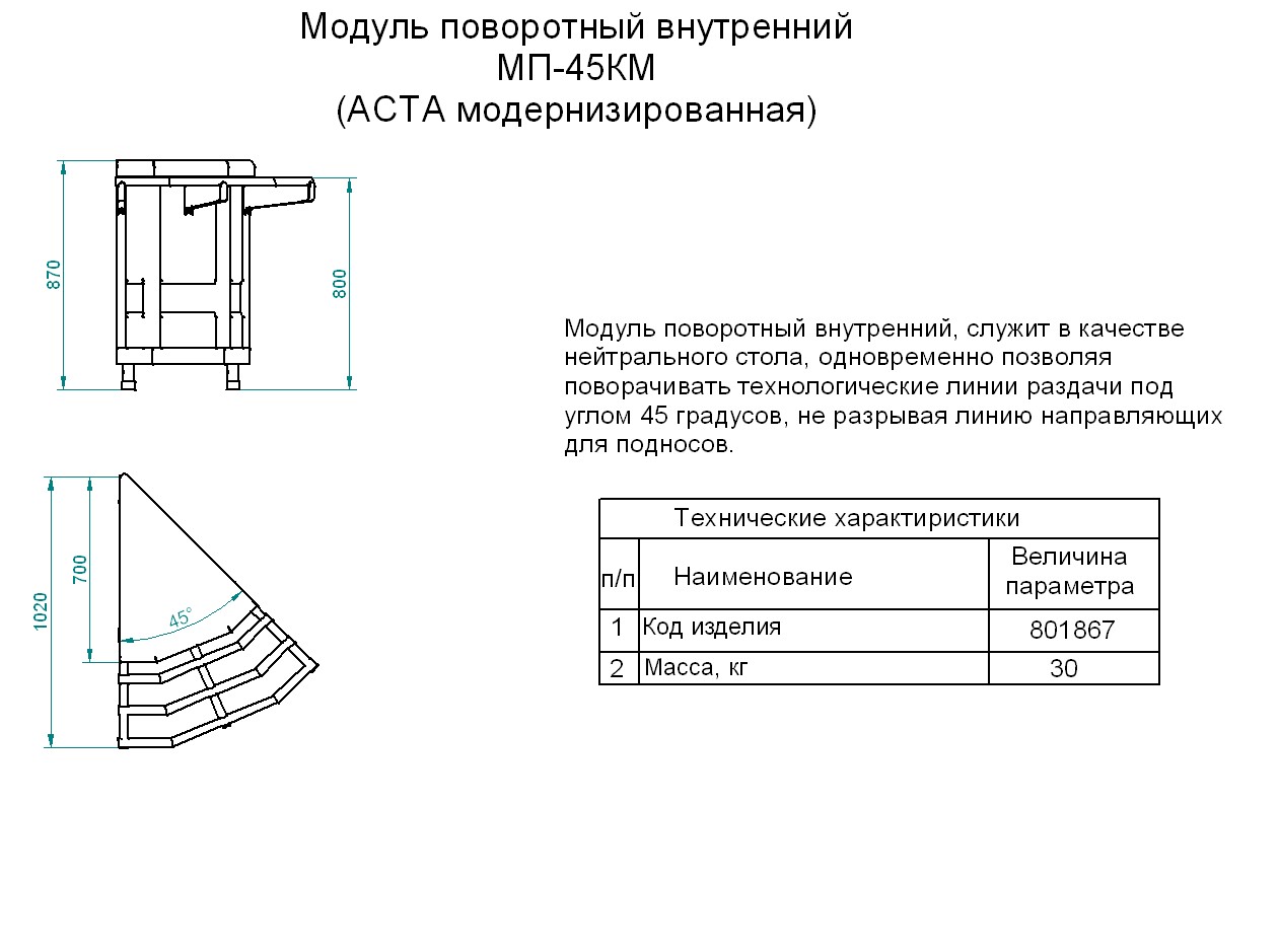 Поворотный модуль Abat МП-45КМ используется в составе линии раздачи Аста для выкладки хлебобулочных, кондитерских изделий, посуды и столовых приборов в составе линий раздач на предприятиях общественного питания и торговли. Конструкция выполнена из нержавеющей стали. Дополнительные характеристики: