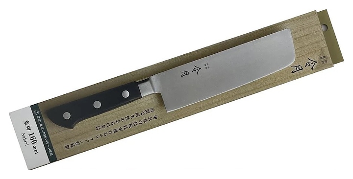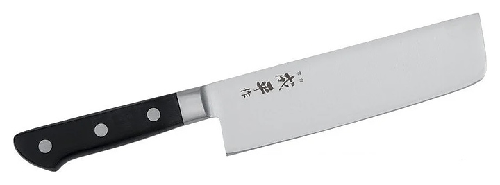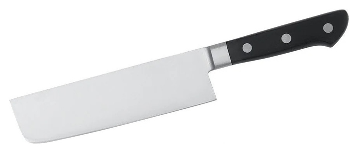 Поварской нож накири Fuji Cutlery FC-1052 серии Reigetsu используется на предприятиях общественного питания и в домашних условиях для шинковки всех видов корнеплодов и фруктов, рубки зелени и удобного перемещения измельченных ингредиентов. Модель оснащена широким прямоугольным однослойным лезвием типа «топорик», нисходящим от утолщенного обуха к режущей кромке. Изделие не рекомендуется мыть в посудомоечной машине. Клинок выполнен из высококачественной нержавеющей стали марки Mo-V с содержанием молибдена и ванадия, рукоятка – из прочного полимера – полиоксиметилена (POM) черного цвета. Особенности:
